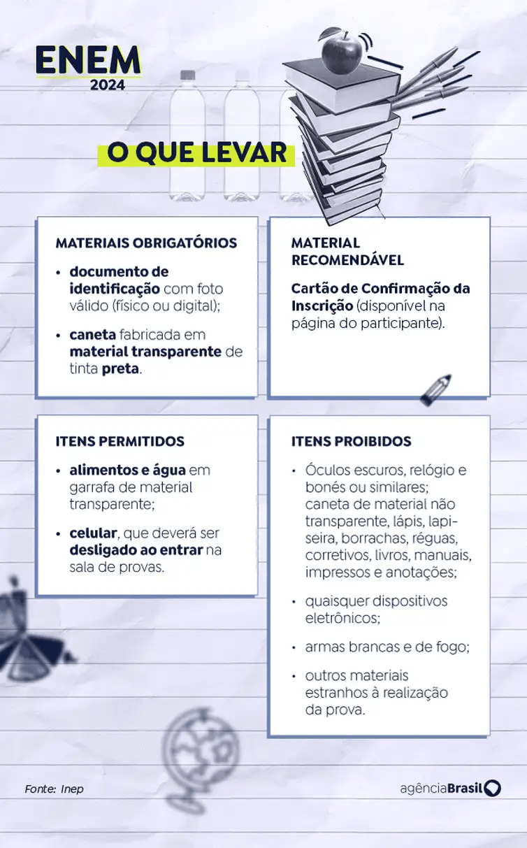 Nesta reta final, a Agência Brasil preparou uma lista de orientações que podem ajudar os candidatos a evitar transtornos ou até mesmo a própria eliminação do exame.